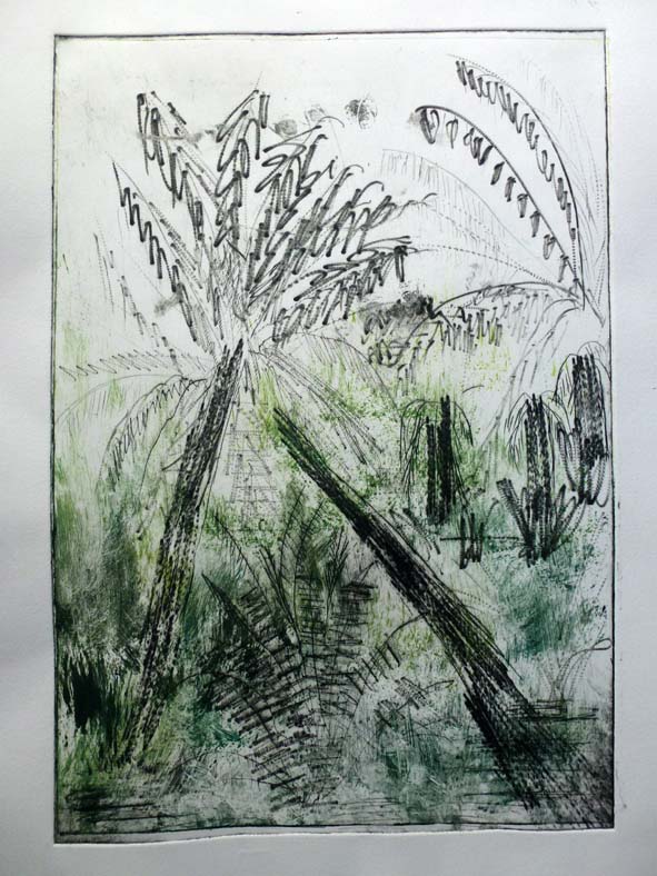 Here I have only applied the large lino cut to the lower two thirds of the gelatine plate.